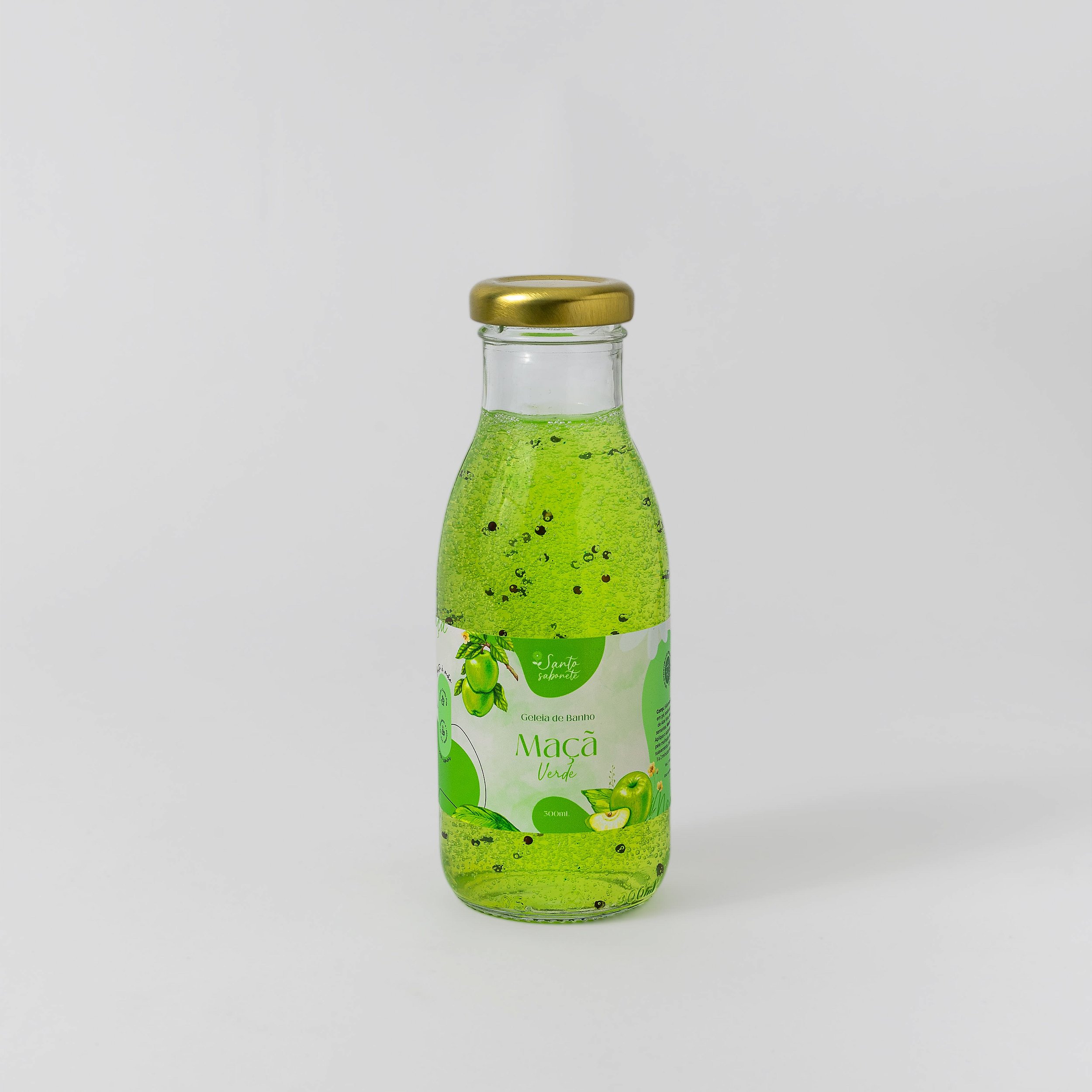 Composição: base para sabonete líquido em gel, essência de maçã verde, extrato de Aloe Vera, lauril, corante e sementes.