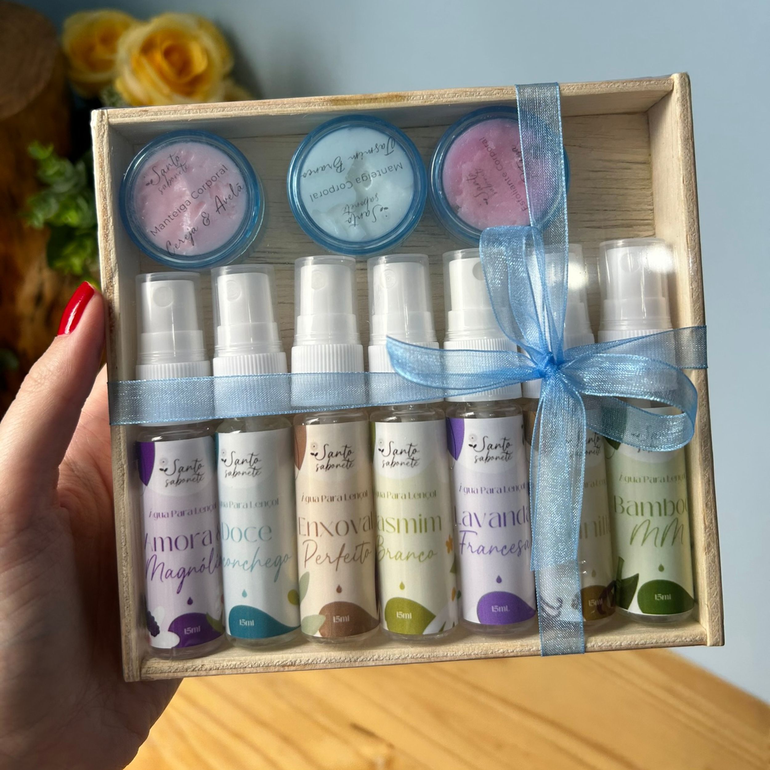 O Kit Olfativo de Águas para Lençol é uma experiência completa para quem deseja conhecer a coleção antes de escolher seus favoritos. Ele reúne 7 águas perfumadas, 2 mini manteigas corporais e 1 mini esfoliante — um convite para testar, sentir e explorar cada aroma com calma.