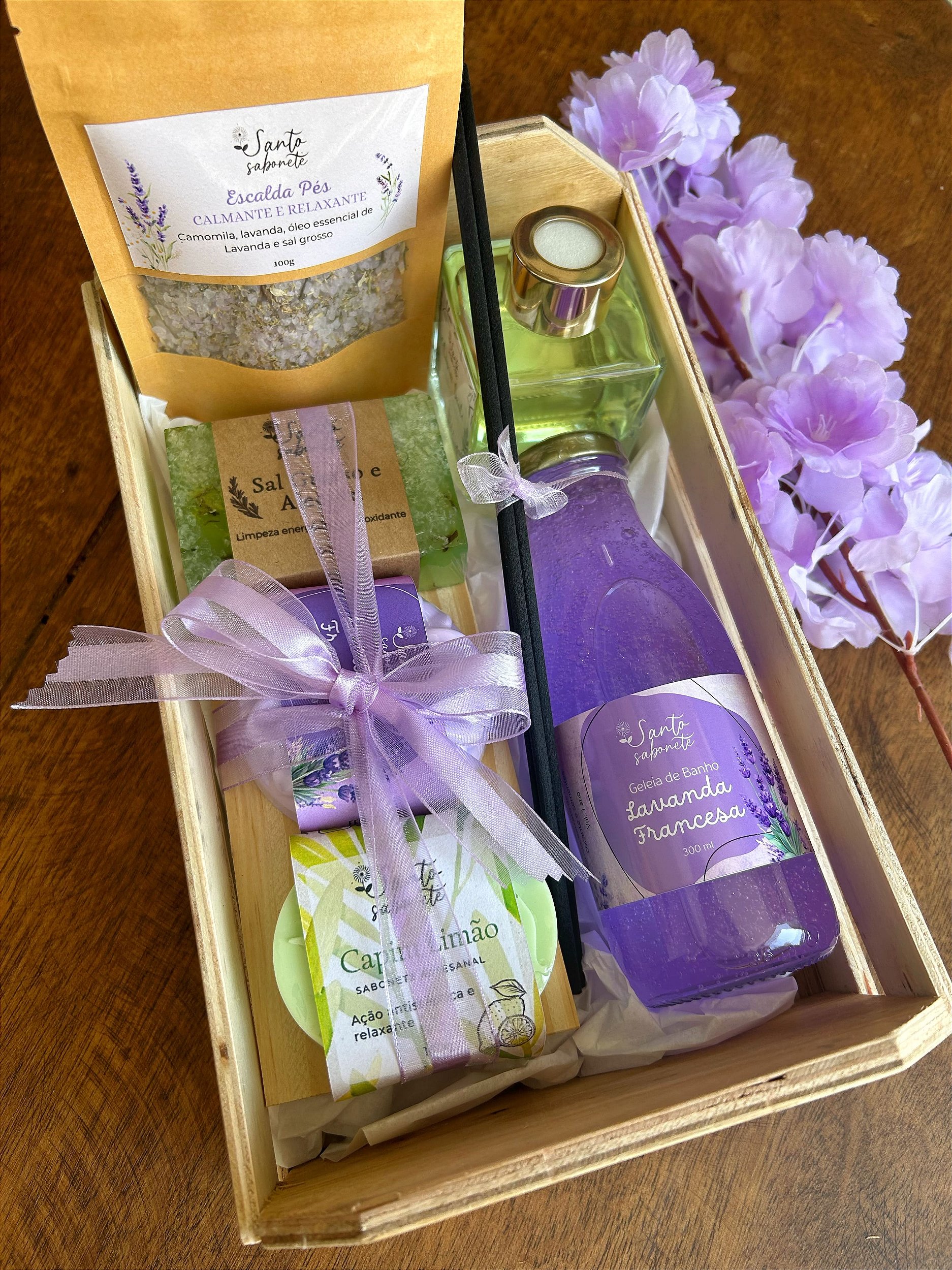 - 1 Escalda Pés de Lavanda e Camomila: Com óleo essencial de lavanda e sal grosso, ideal para relaxar e aliviar o cansaço dos pés.