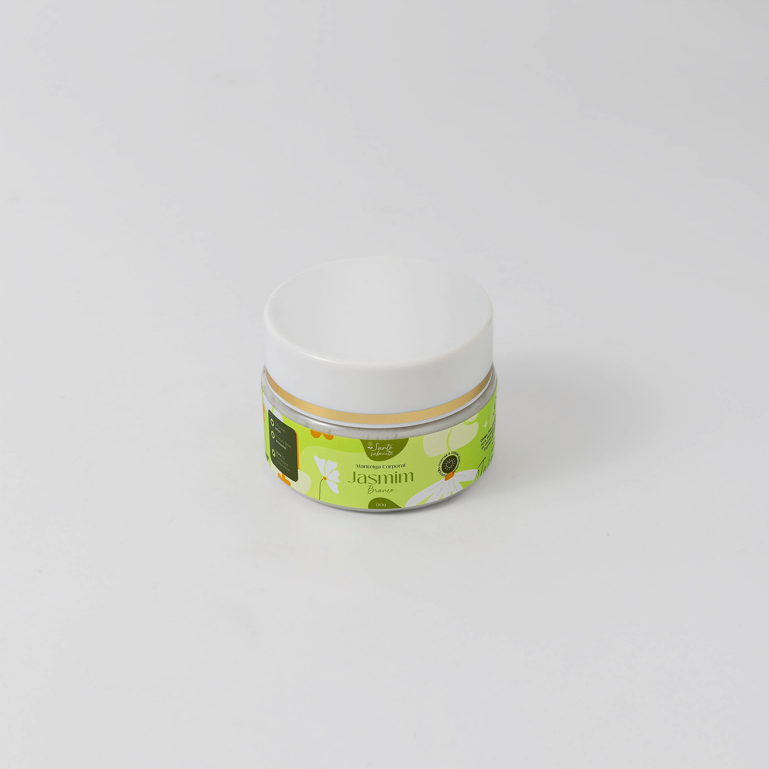 Nossa manteiga corporal combina o aroma suave e floral do jasmim branco com uma poderosa sinergia de ativos naturais: óleo de abacate, manteiga de cupuaçu e extrato de melaleuca.