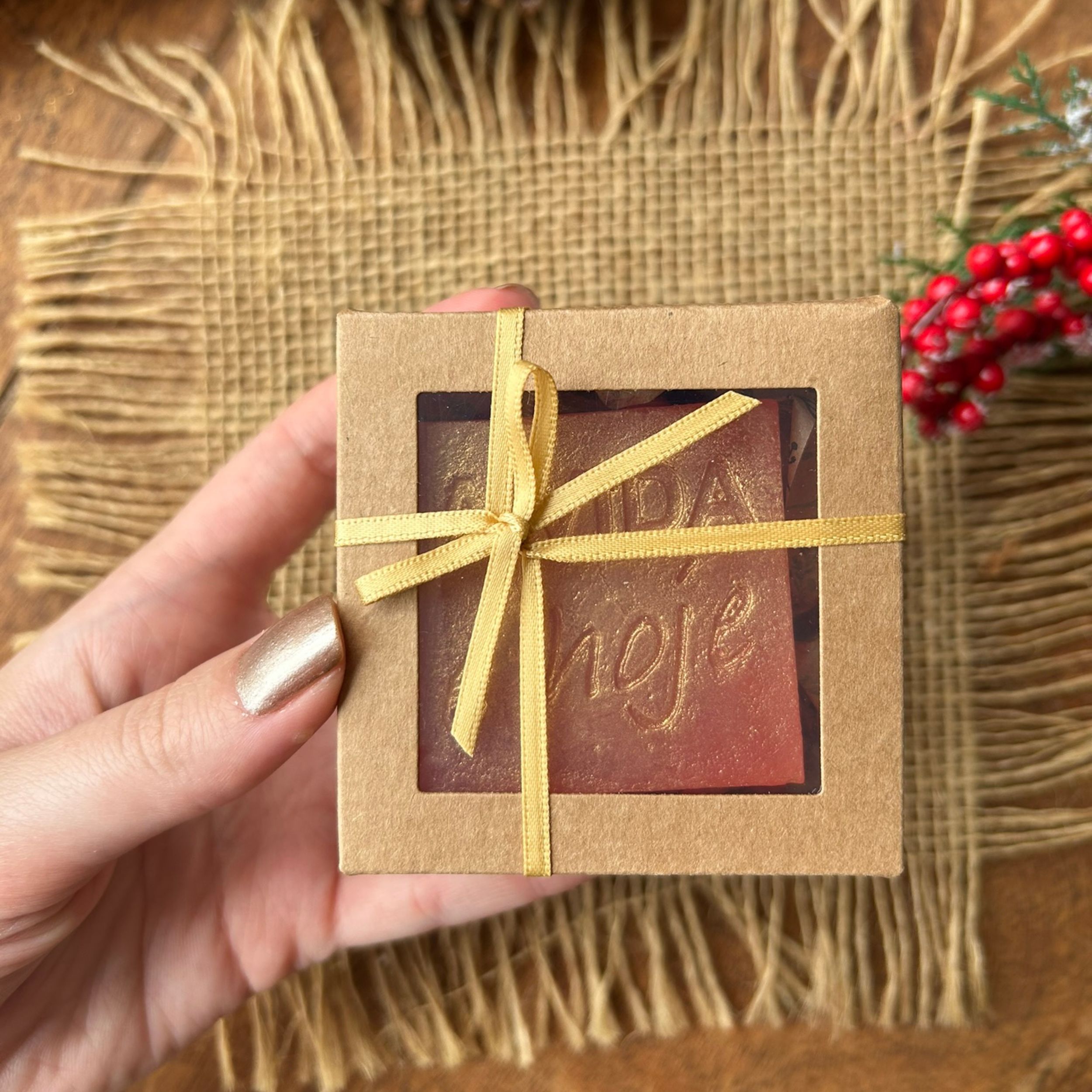 Nosso sabonete artesanal de Cravo e Canela, com a frase “A vida é hoje” gravada na barra, chega em uma caixinha presenteável, perfeita para encantar no Natal.