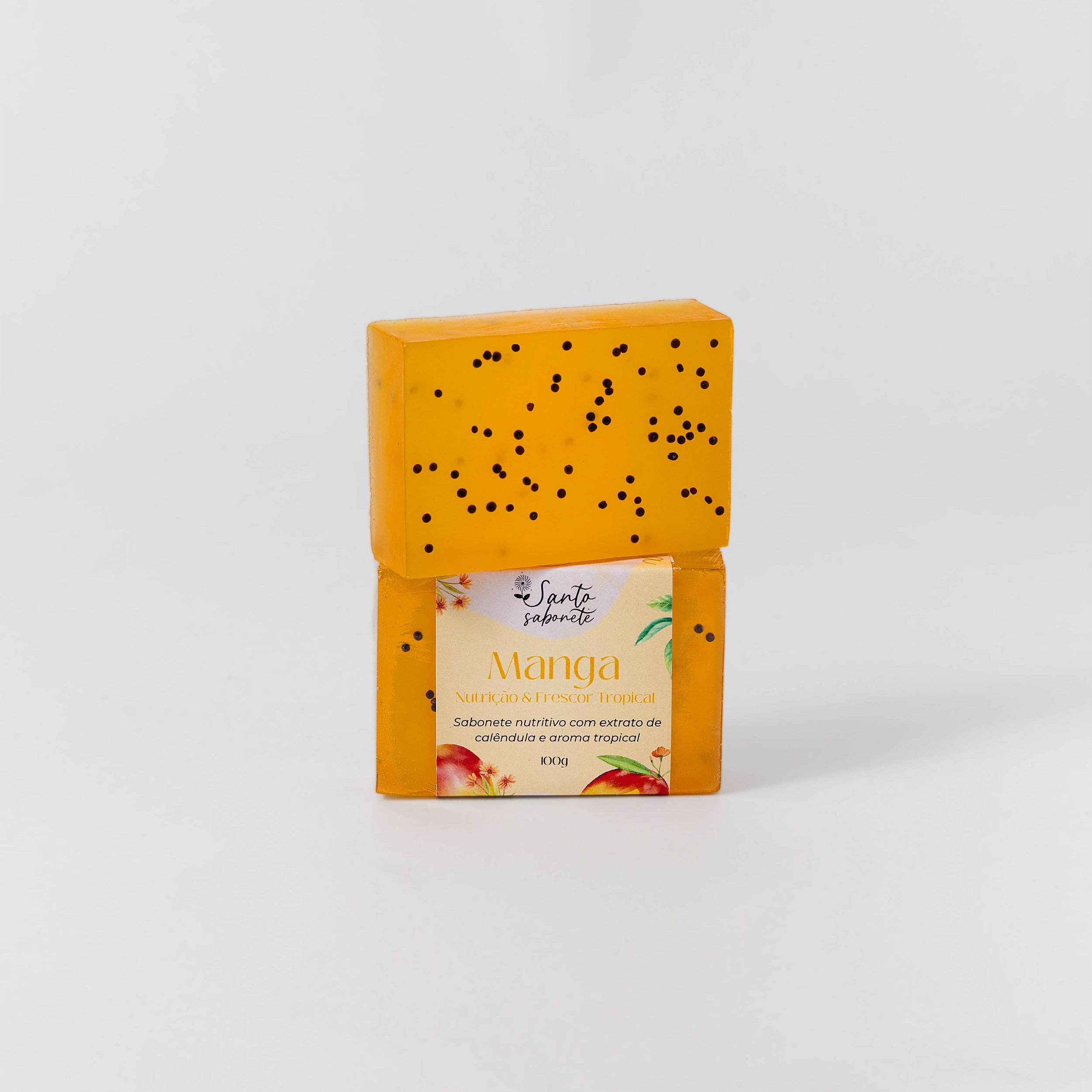 Composição: base glicerinada, extrato de calêndula, essência de manga, corante e sementes.
